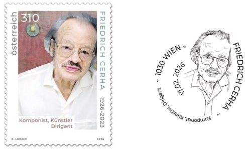 On 17 February, Austrian Post will issue a special stamp to mark the 100th birthday of Friedrich Cerha. The stamp, designed by master engraver Kirsten Lubach, will be issued in a print run of 210,000 copies with a face value of €3.10.